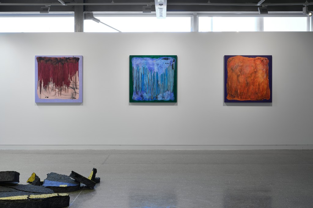 Left to right, Korowai, Blue Zone and Whenua. 1000x1000mm, Natural and Synthetic pigments, marble dust iron-sand on board.