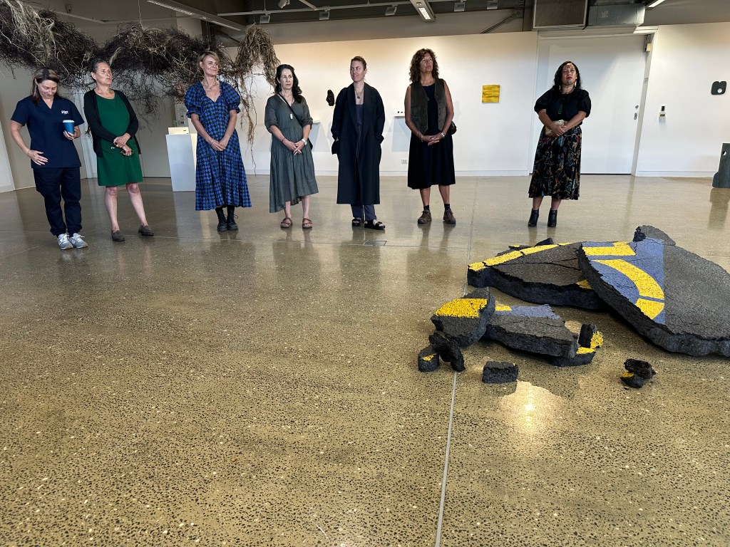 Opening speech at ONEPŪ , participating artists from left to right Inga Fillary, Margaret Feeney, Melanie Arnold, Michelle Mayn, Natalie Tozer, Jana Wood (and visitor Tatum Vaughan Rodger on right)